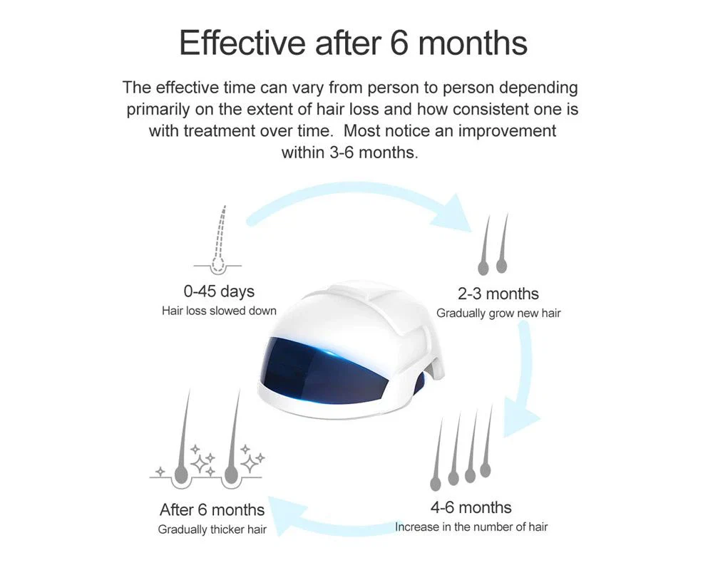 Treatment routine: For optimal results, it is recommended to use the helmet every other day, with sessions of 15 to 20 minutes at a time. After 3 months, you can expect the first results and after 12 months you will have achieved your optimal results.